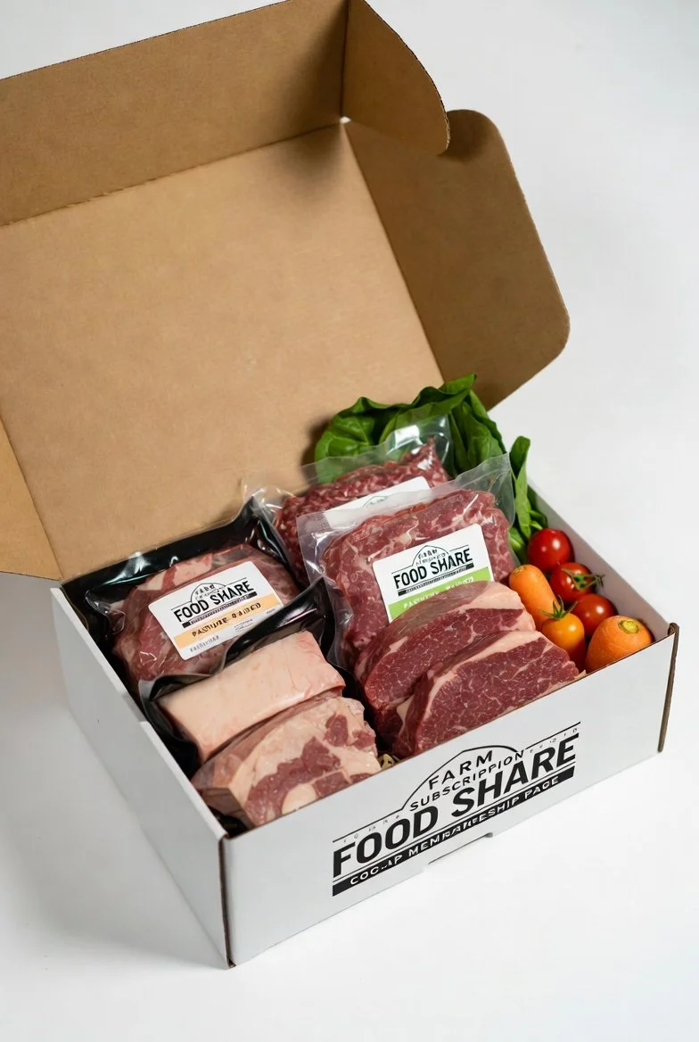 We sell 1/16th beef shares and customizable subscription boxes of pasture-raised beef, goat meat, and seasonal garden produce.